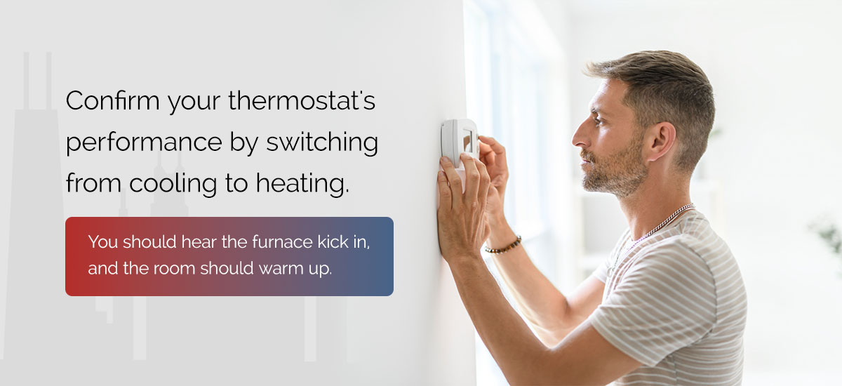 Confirm your thermostat’s performance by switching from cooling to heating. You should hear the furnace kick in, and the room should warm up. If nothing happens, your thermostat may be faulty.